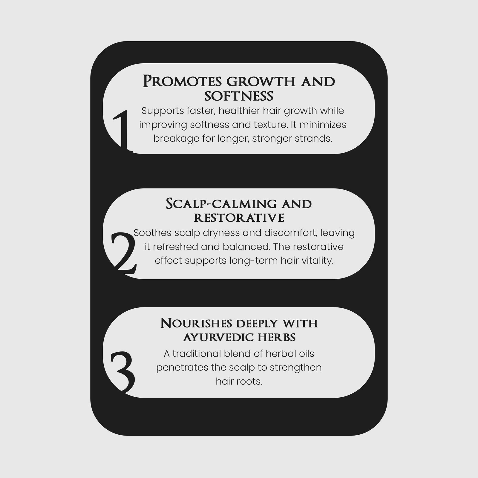 This potent Ayurvedic blend, infused in virgin coconut oil, is designed to deeply nourish the scalp, reduce hair fall, and encourage thick, healthy growth. Enriched with powerful botanicals like Gotukola, Mugunuwanna, Neem, Nilavariya, Keekiridiya, Fenugreek, and Lunuwila, it helps strengthen hair from the roots, improve circulation, and restore natural shine. Regular use not only supports hair vitality but also reduces dandruff and soothes stress, leaving both scalp and mind refreshed.