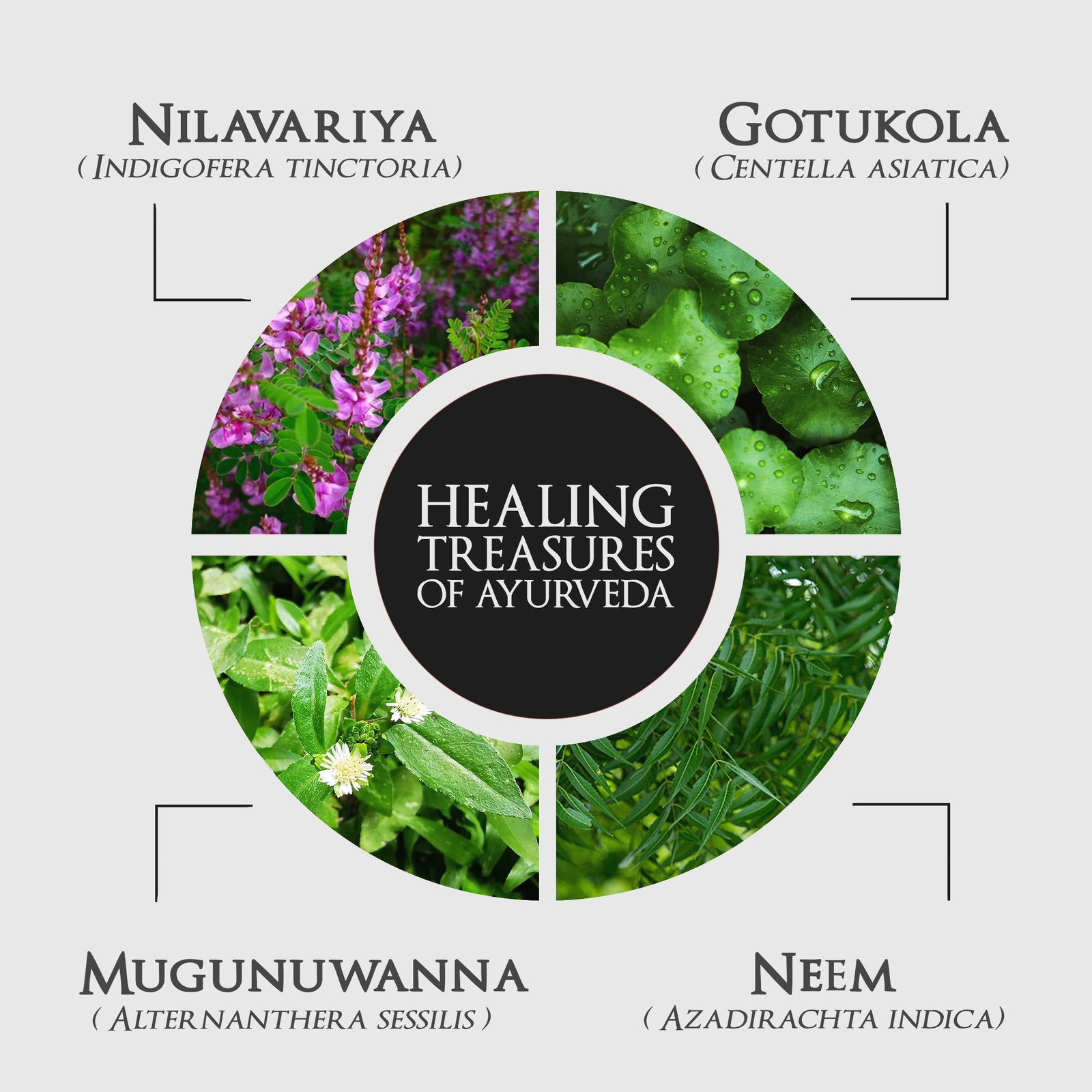 Gotukola, Mugunuwanna, Neem, Nilavariya, Keekiridiya, Fenugreek, Lunuwila, Virgin Coconut Oil.