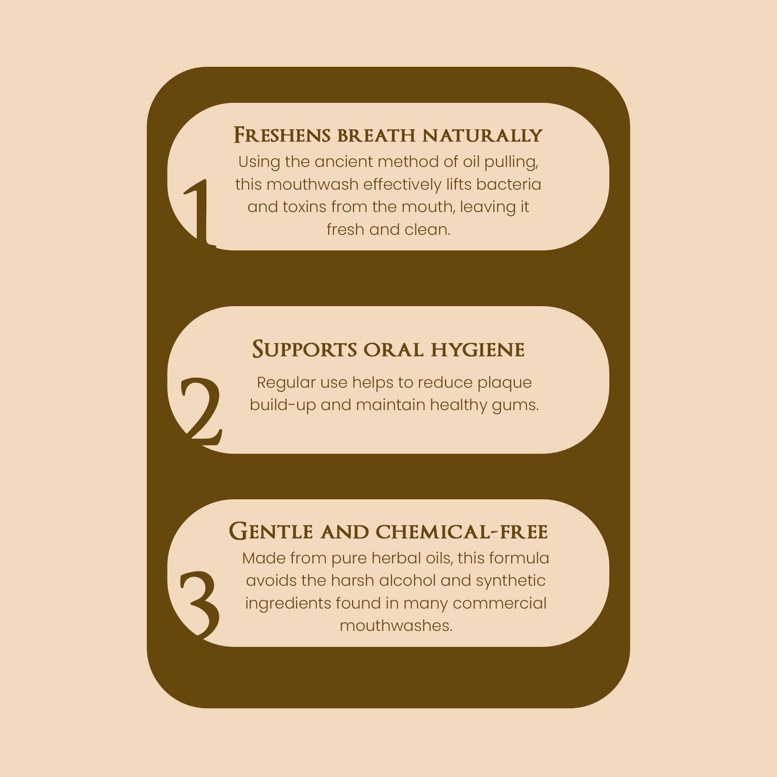 Rooted in the wisdom of Ayurveda, this oral care oil is a natural solution for a healthier smile. Formulated with virgin coconut oil and a potent blend of herbal extracts, it helps whiten teeth, freshen breath, and strengthen gums, while supporting overall oral health. Infused with Mint, Clove, and Cinnamon, it combats odor-causing bacteria, while Licorice, Alum, and Ailanthus Excelsa work to protect teeth and prevent decay. Regular use promotes a clean, refreshed mouth and stronger gums—naturally.