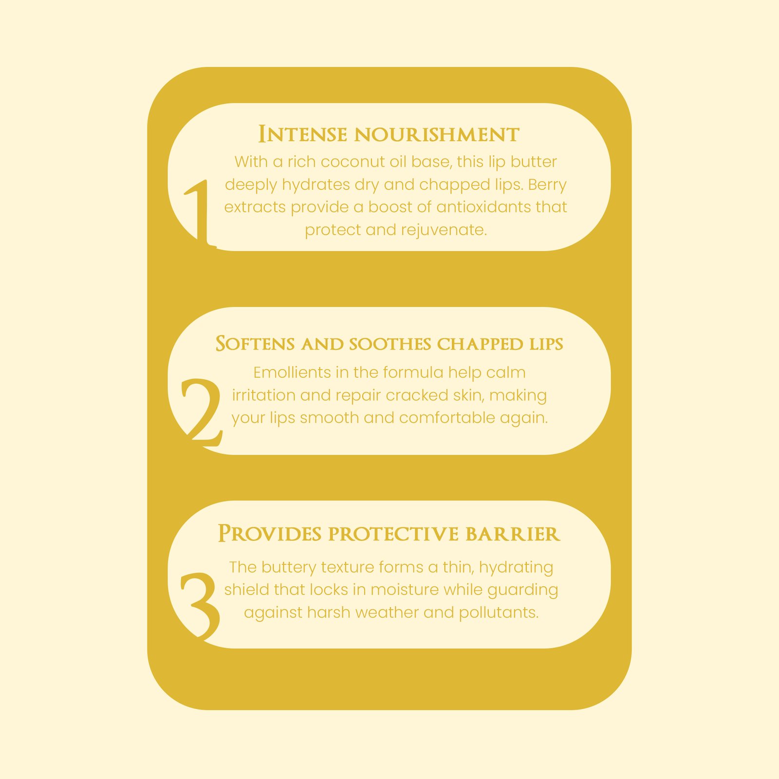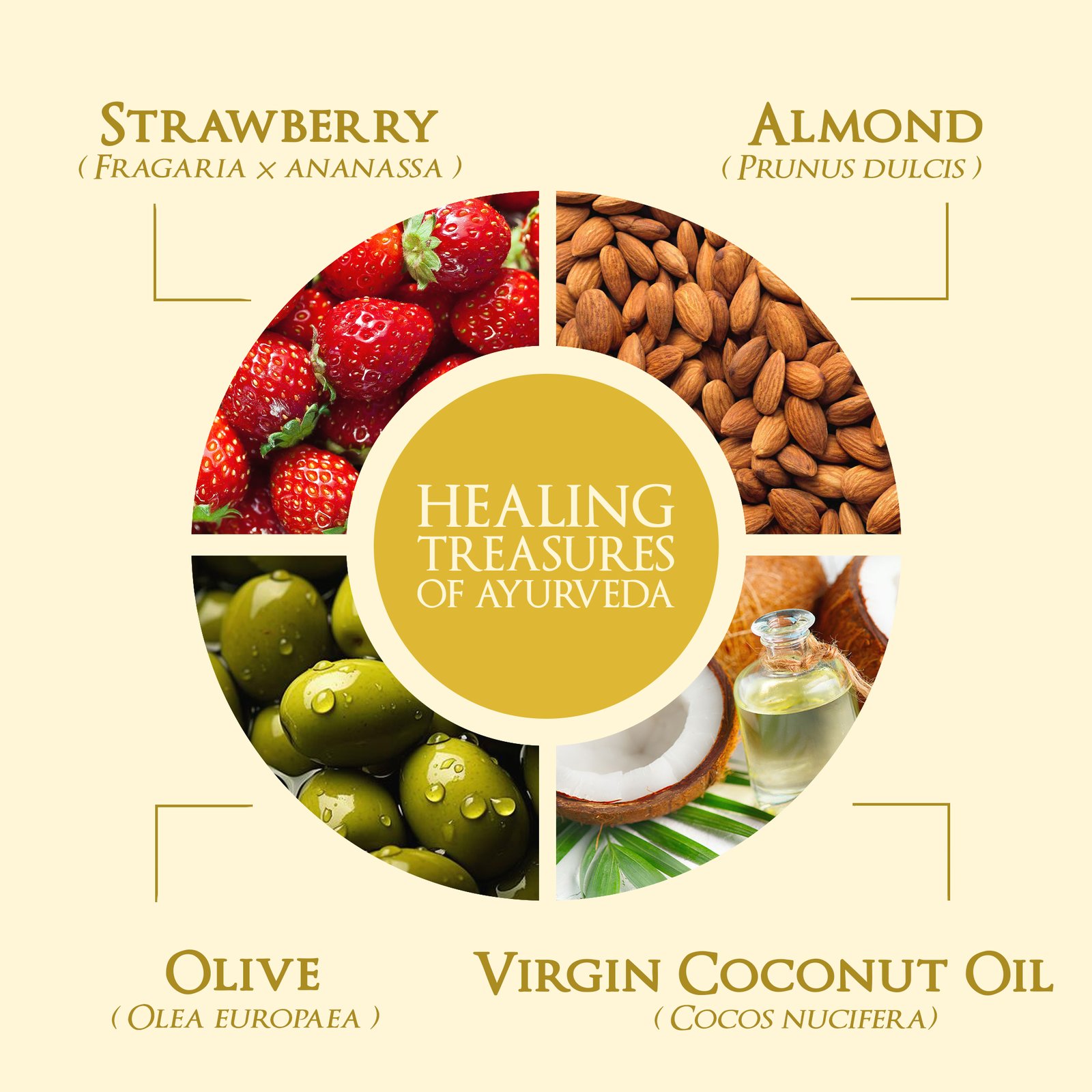 Virgin Coconut Oil, Olive Oil, Strawberry, Beeswax, Shea Butter, Almond Oil, Vitamin E.