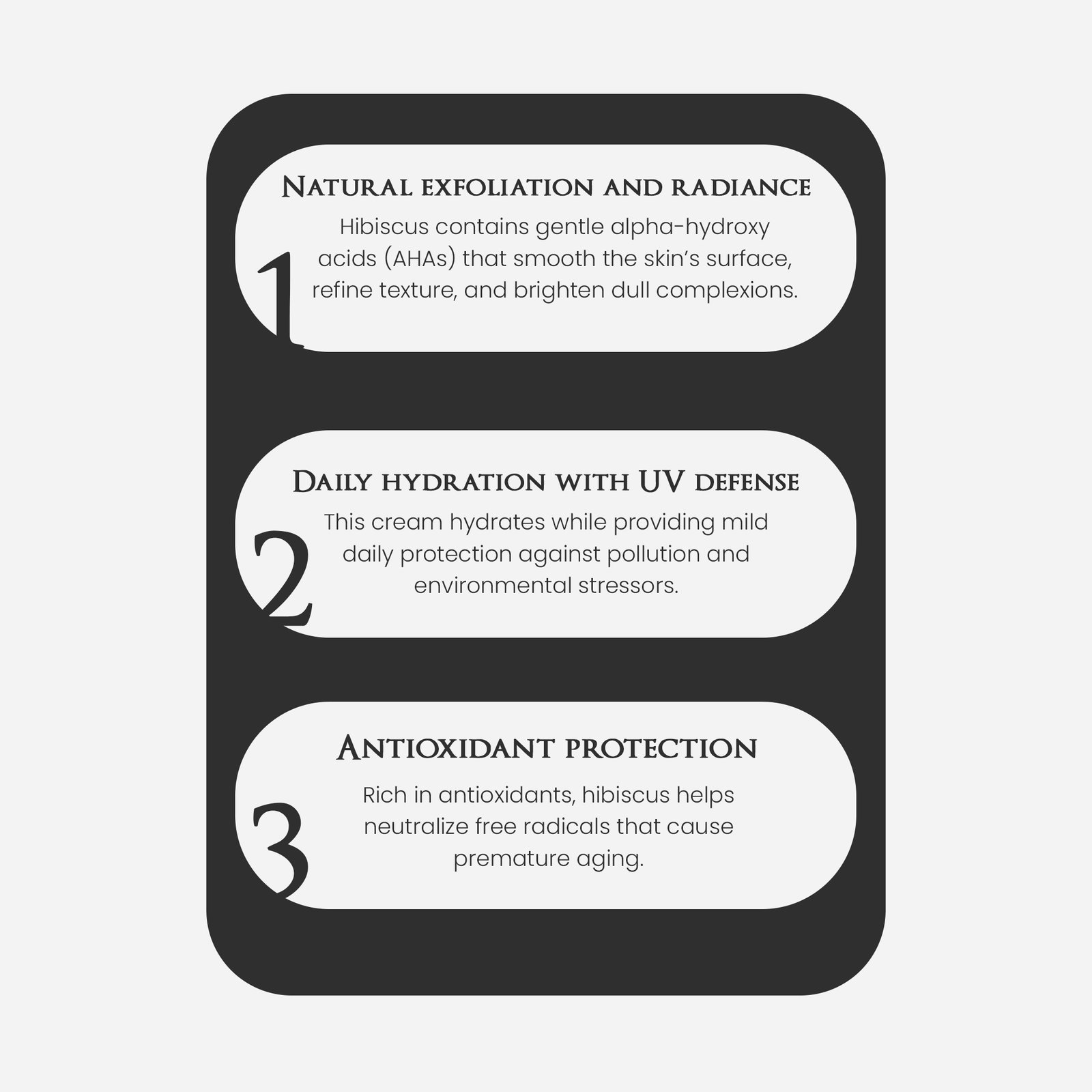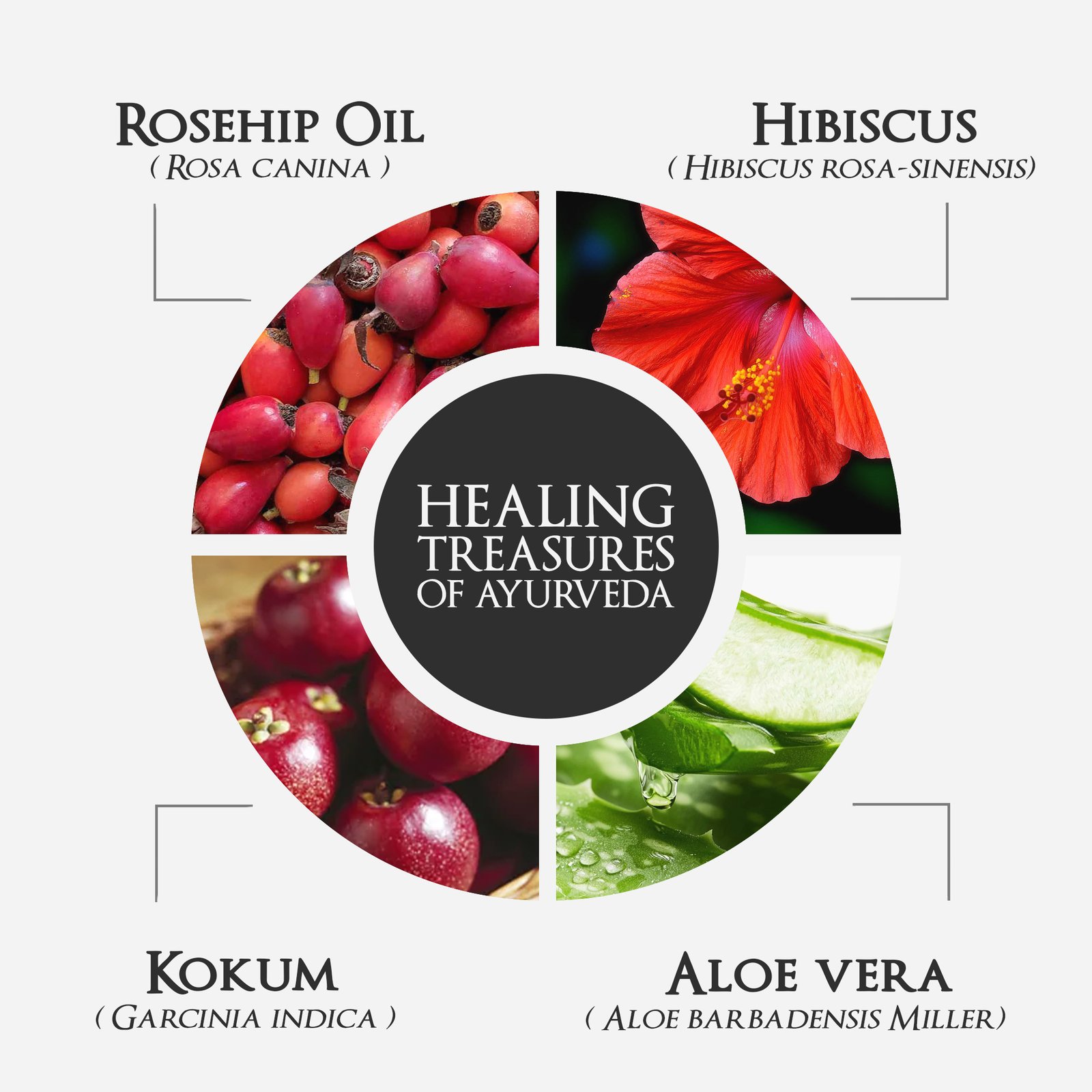 Hibiscus, Rosehip Oil, Kokum, Aloe Vera, Shea Butter, Cocoa Butter, Coconut Milk, Vitamin E.