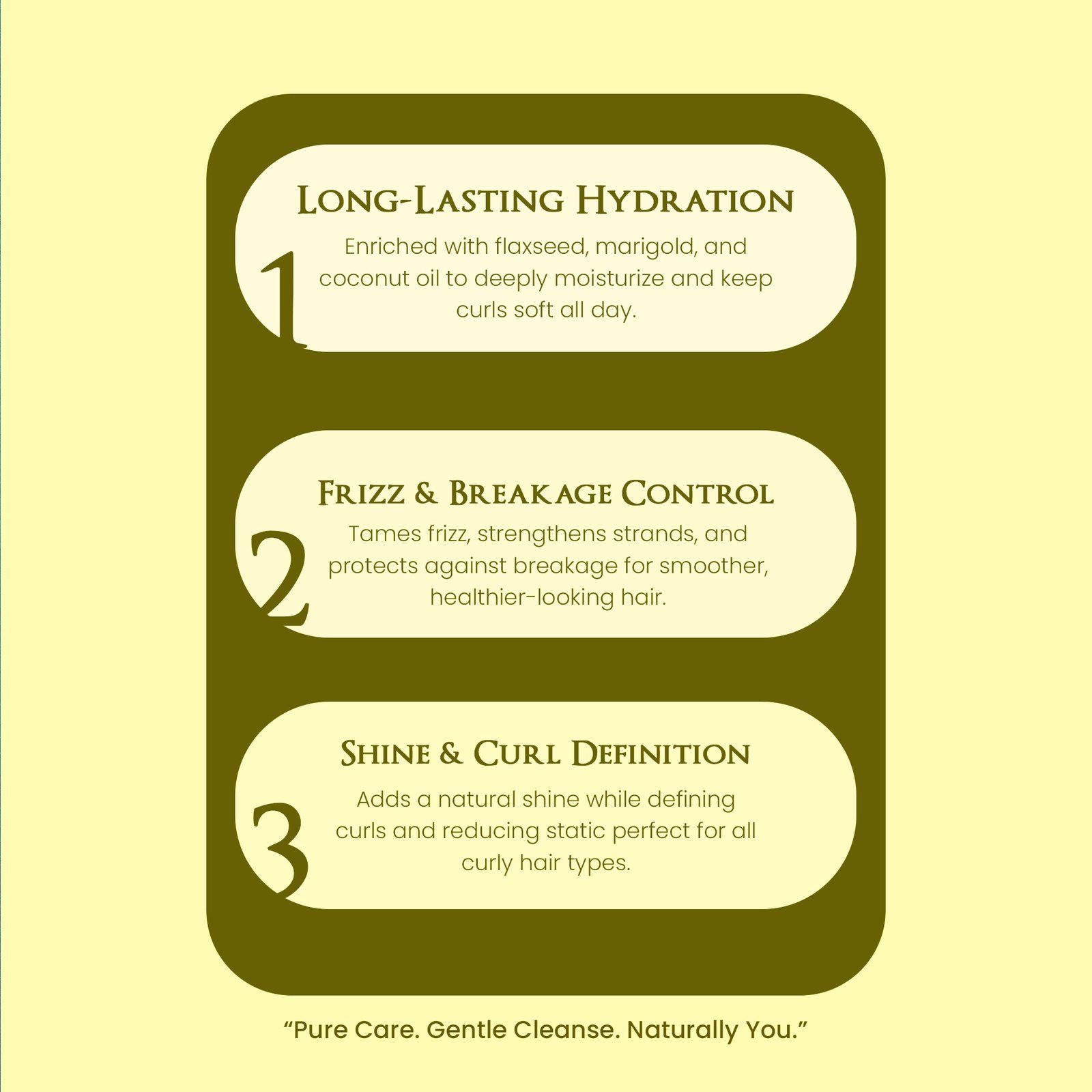 Designed for all curly hair types, this leave-in conditioner smooths, strengthens, and protects hair from static, UV damage, and environmental stress. Coconut Milk fights frizz and adds volume to curls, while Flaxseed, rich in omega-3 fatty acids, nourishes hair, boosts scalp circulation, and strengthens strands. Marigold Flower Extract hydrates, reduces dandruff, soothes an itchy scalp, and leaves a subtle relaxing fragrance. Regular use ensures soft, manageable, and healthy-looking curls.