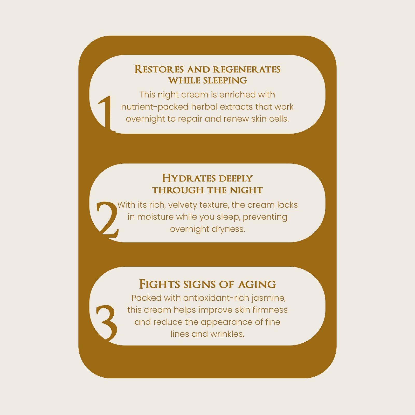 Indulge your skin in this luxurious night-time ritual, a rich yet non-greasy cream infused with the delicate essence of Jasmine and Rose. Blended with deeply nourishing Virgin Coconut Oil, Jojoba, and Cocoa Butter, it works overnight to restore, brighten, and hydrate tired skin—revealing a refreshed, luminous glow by morning. Enhanced with Vitamin E, this soothing botanical blend helps replenish moisture, smooth texture, and awaken your natural radiance while you sleep.