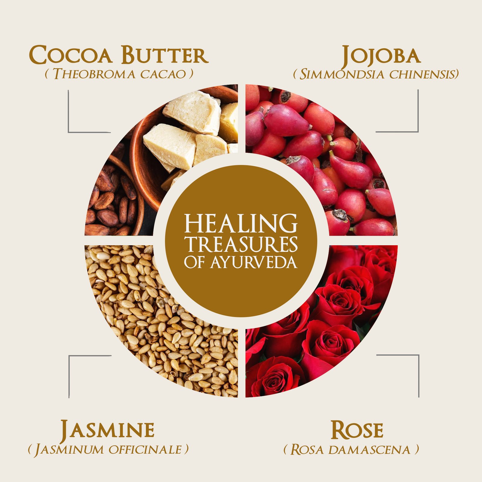 Virgin Coconut Oil, Jojoba, Cocoa Butter, Jasmine, Rose, Vitamin E.