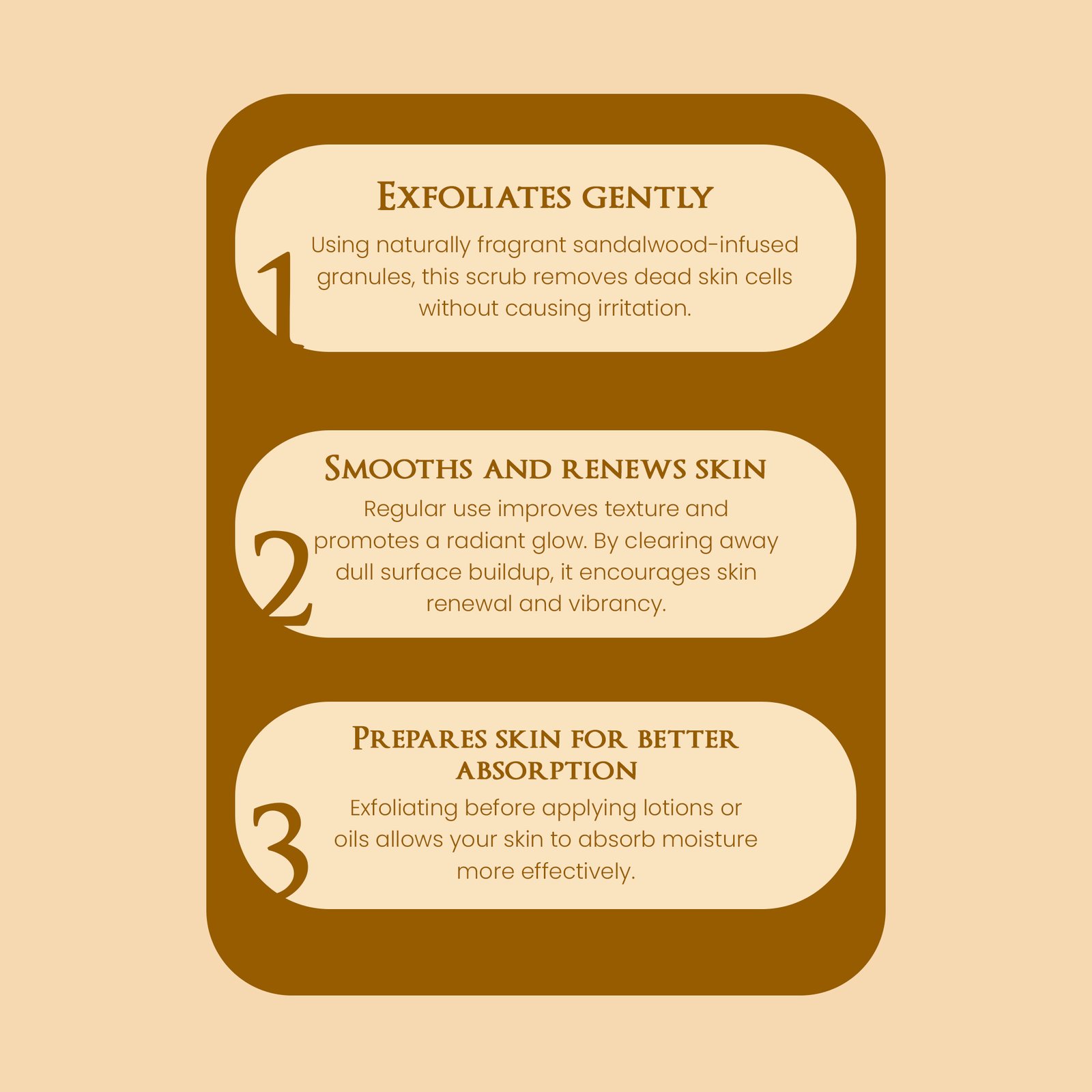Reveal your skin’s natural radiance with this gentle yet effective Ayurvedic exfoliator. Infused with White & Red Sandalwood Extracts to calm and brighten, Walnut Shell Powder to polish away dead skin cells, and Aloe Vera to soothe and hydrate, it works to smooth texture, unclog pores, and enhance natural glow. Enriched with Coconut Oil, Jojoba Oil, and Vitamin E, this nourishing blend leaves skin soft, refreshed, and visibly rejuvenated without stripping away moisture.