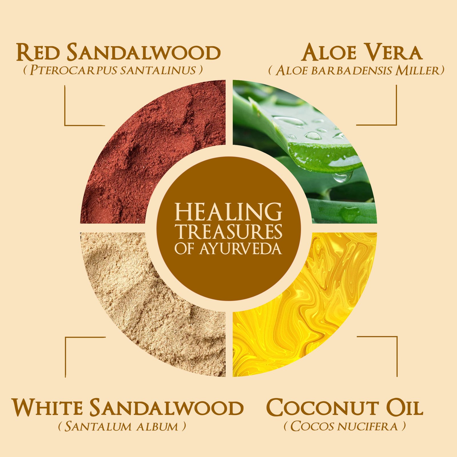 White & Red Sandalwood Extracts, Walnut Shell Powder, Coconut Oil, Jojoba Oil, Aloe Vera, Vitamin E.
